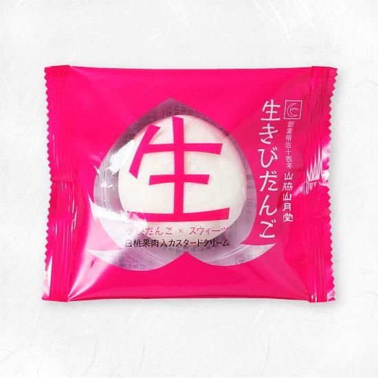 ふわっふわ新食感のおもちで、角切白桃蜜煮入りカスタードクリームを包みました。
